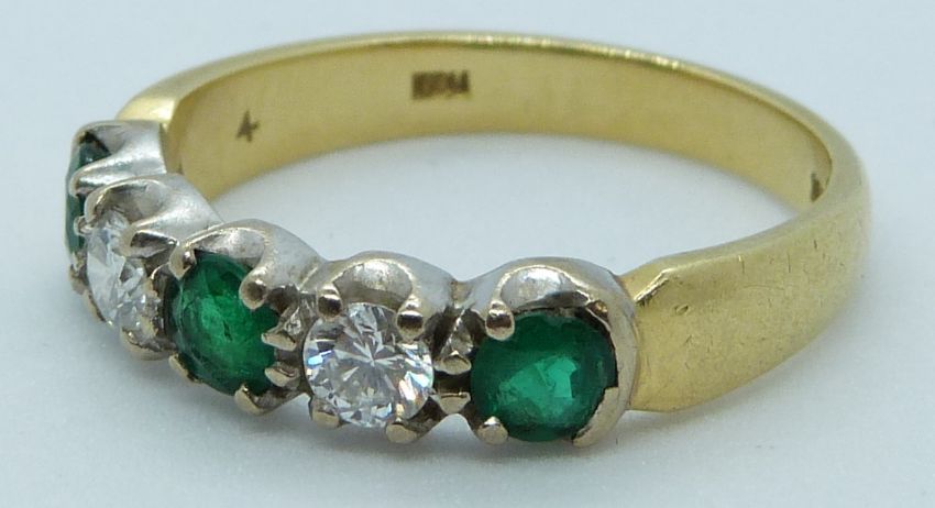 An 18ct gold ring set with diamonds and emeralds of approximately 0.2ct, 4.3g, size O