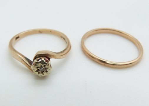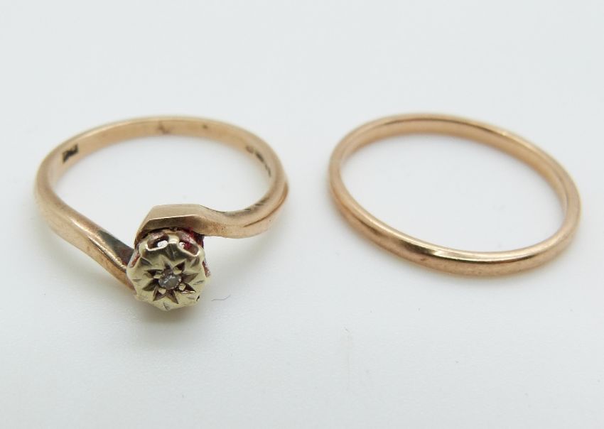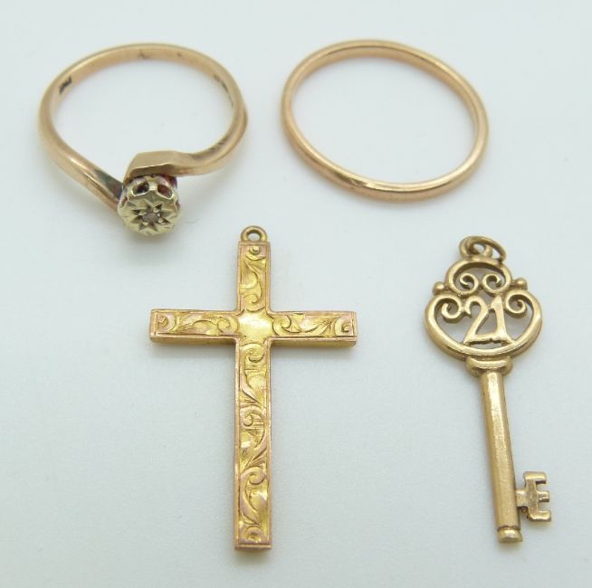 A 9ct gold ring set with a diamond, a 9ct gold ring and a 9ct gold cross, 5g