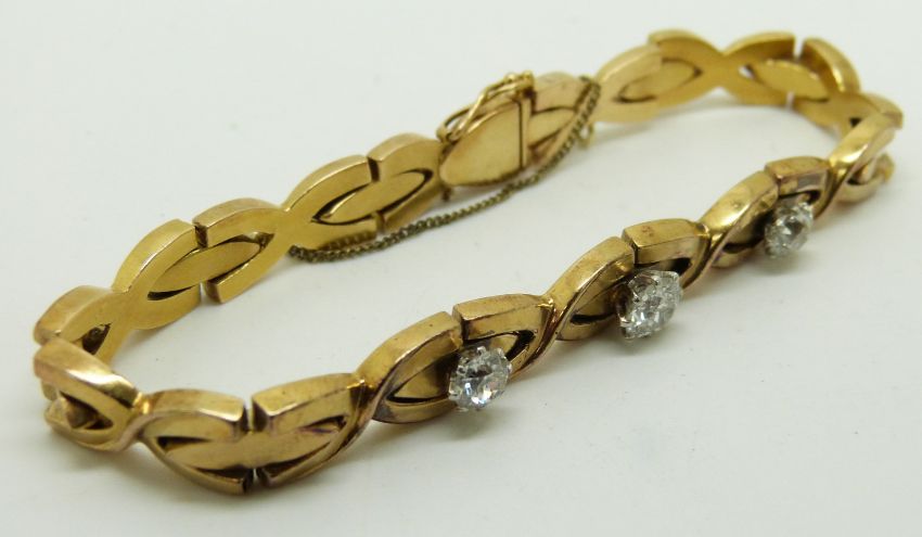 A 14ct gold bracelet set with three round cut diamonds of approximately 0.5ct, 0.35ct & 0.35ct, 19.4g