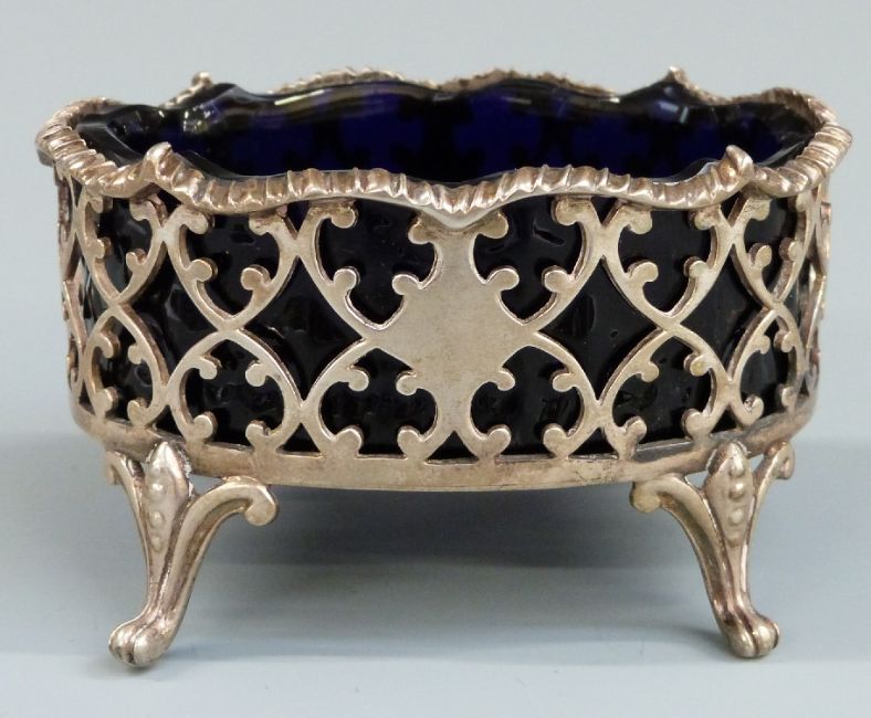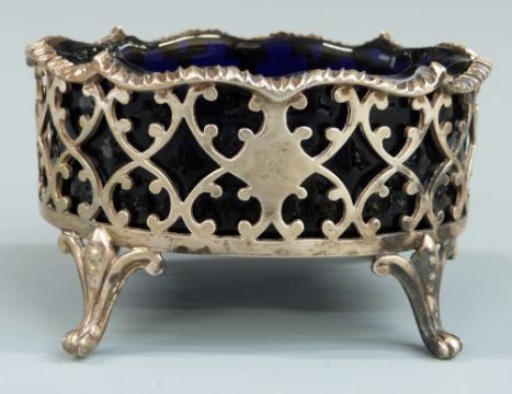 Three Georgian and later hallmarked silver open salts with blue glass liners, London 1802, 1853 and 1902, length of largest 8.5cm, weight without liners 150g