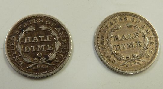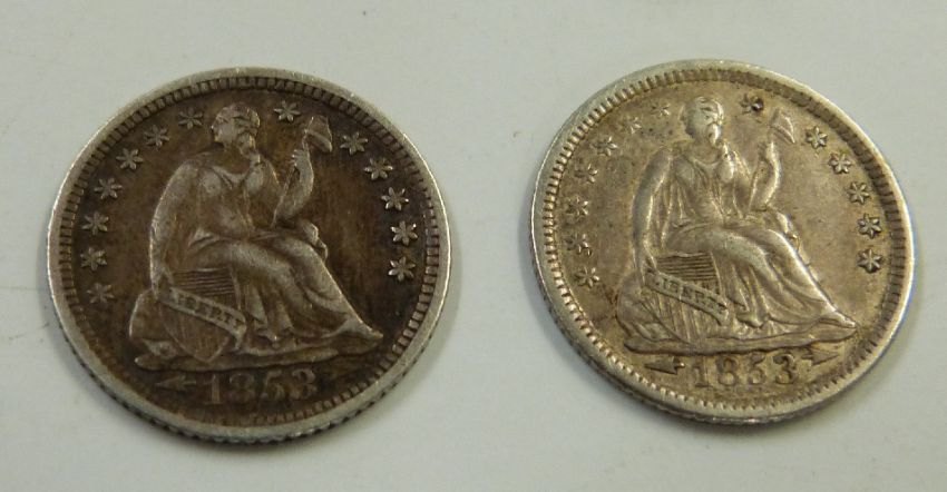 A small Black Forest carved casket containing a collection of coinage including silver and two 1853 USA half dimes with arrows