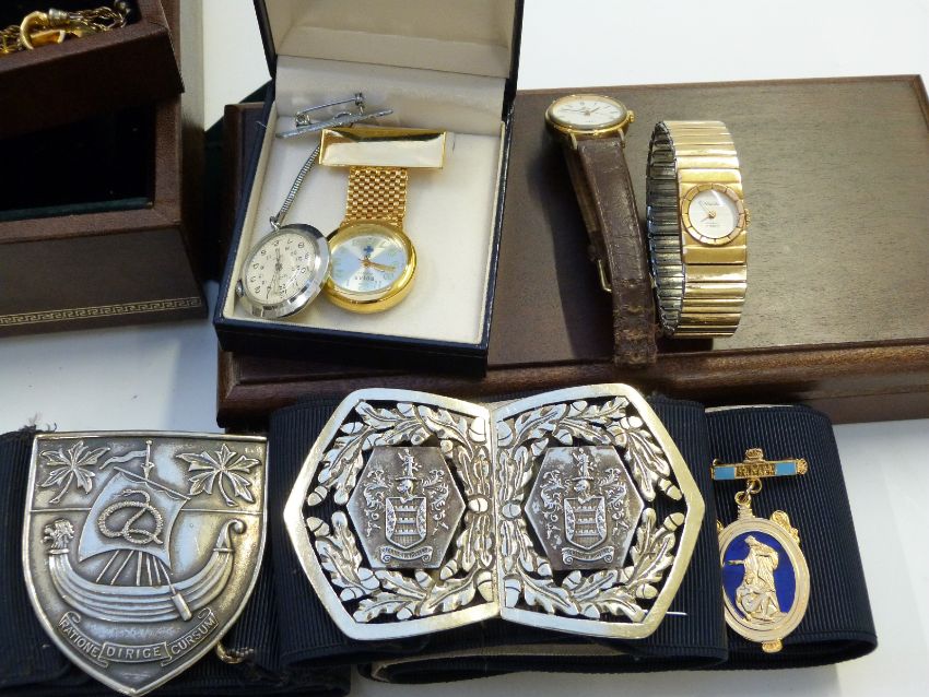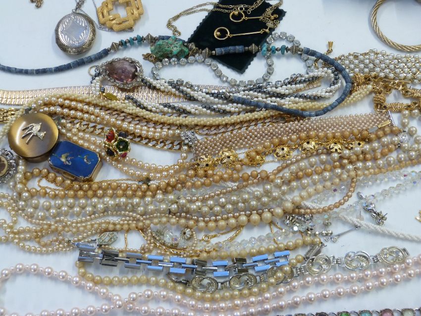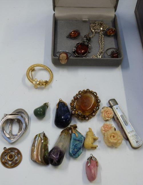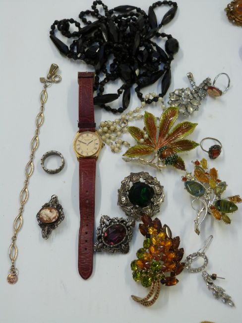 A collection of costume jewellery including silver necklace, Mappin and Webb watch, 9ct gold St Christopher charm, Art Deco silver ring, Miracle brooch, Trifari, Victorian jet beads, Exquisite, filigree cameo brooch etc