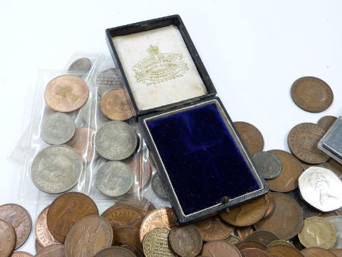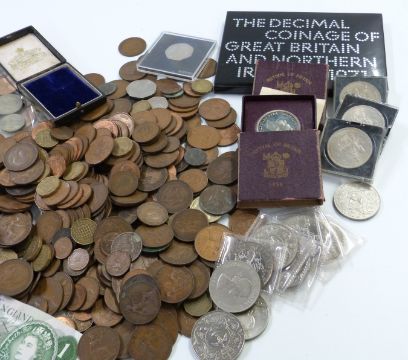 An amateur collection of UK with some overseas coinage George III onwards, small silver content, modern crowns etc and some UK banknotes including a consecutive pair of J S Fforde £1 notes