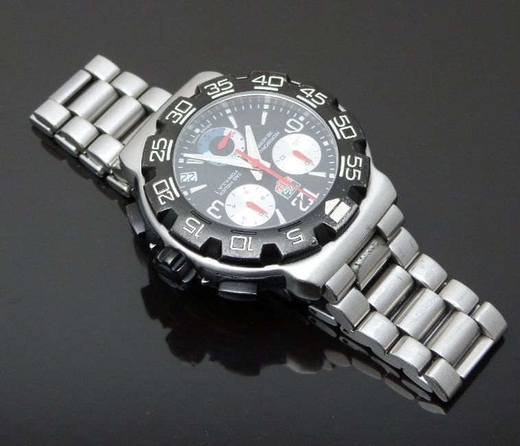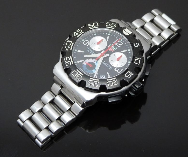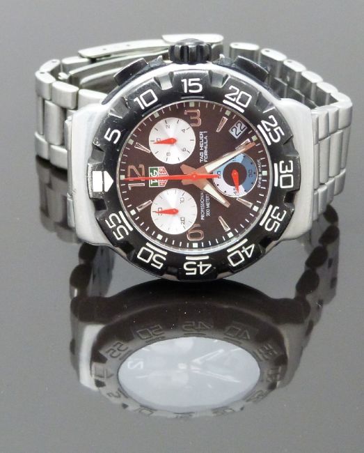 TAG Heuer Formula 1 gentleman’s chronograph wristwatch ref. CAC1110-0 with date aperture, luminous hour and minute hands, red centre seconds and sub dial hands, silver subsidiary dials, black dial, black unidirectional bezel, stainless steel case and quartz movement, case diameter 40mm, serial number CD0472, in original case with outer box, guarantee card, tags and paperwork.