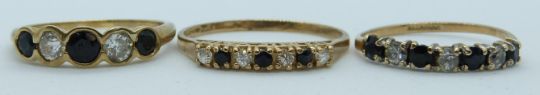 Three 9ct gold rings set with sapphires and cubic zirconia, 5.1g