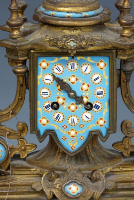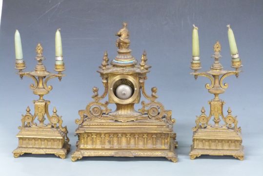 French brass figural clock garniture with enamelled decoration, 43cm tall