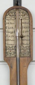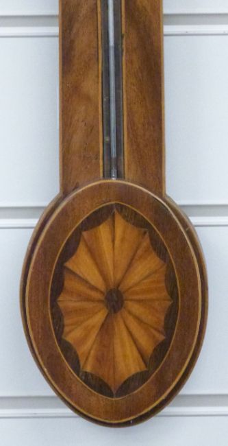 Georgian style stick barometer in mahogany case with boxwood string inlay, the silvered prediction dial engraved with foliate decoration, the cistern cover with shell inlay, height 82cm