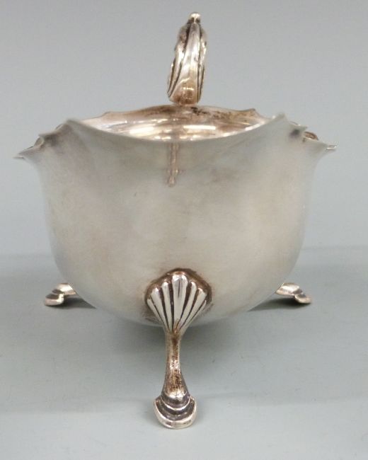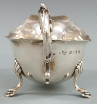 George VI hallmarked silver sauce boat with shaped edge and raised on three pad feet, Birmingham 1940 maker S Blanckensee & Son Ltd, length 14cm, weight 74g