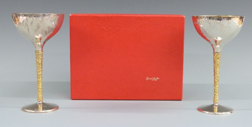 Pair of Stuart Devlin hallmarked silver chalices with gilt interior, hammered finish and textured gilt stems, London 1972, height 16cm, weight 420g, in Stuart Devlin black and red box