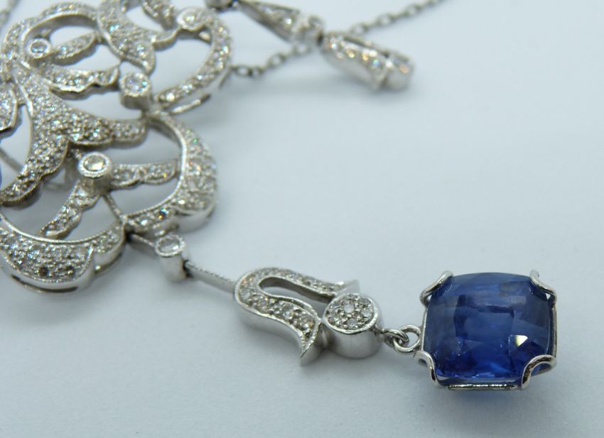 A platinum necklace set with round cut diamonds in a stylised foliate design and a cushion cut natural untreated sapphire measuring 5.13ct, with GIA certificate