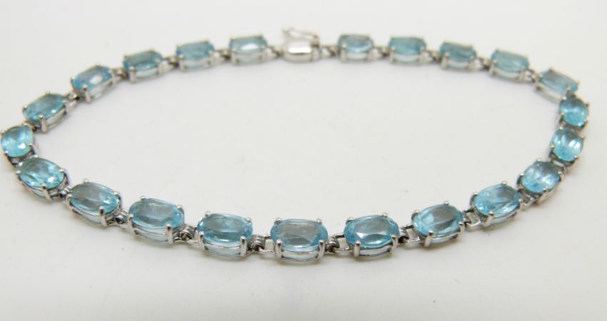 A 9ct white gold tennis bracelet set with oval blue topaz, 5.9g