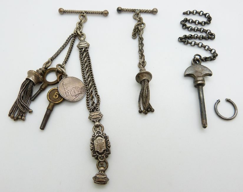 Three hallmarked silver fob chains/ Alberts, silver fob and charms