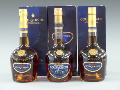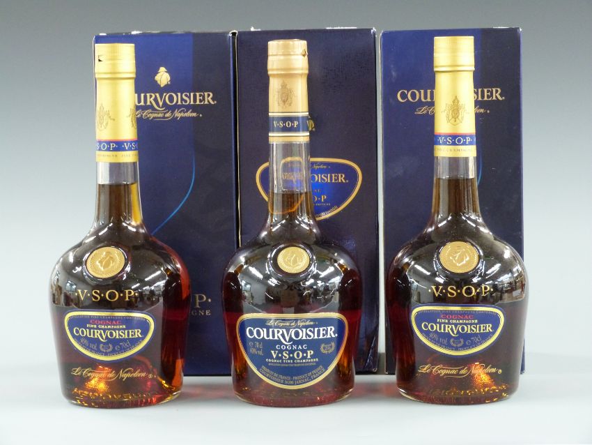 Three bottles of Courvoisier V.S.O.P Fine Champagne Cognac, 700ml, 40% vol, in original presentation boxes