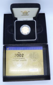 Elizabeth II 2002 proof gold full sovereign, shield reverse, cased with booklet, certificate no 03623