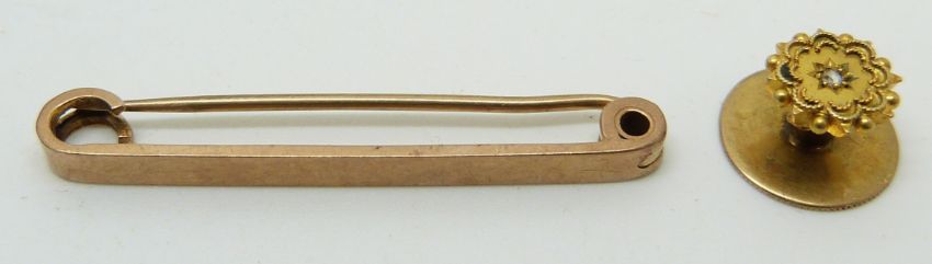 A 9ct gold brooch, Victorian stud set with a diamond, 9ct gold tie pin (3.3g) and further studs