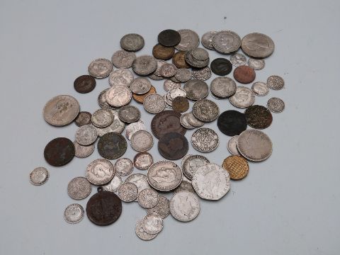 A small collection of largely UK coinage including an 1891 Queen Victoria crown and a Charles II farthing, together with mixed silver coinage
