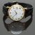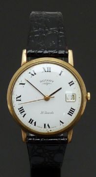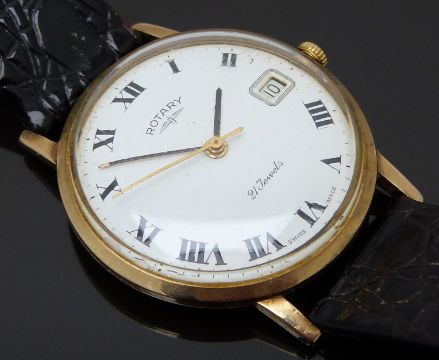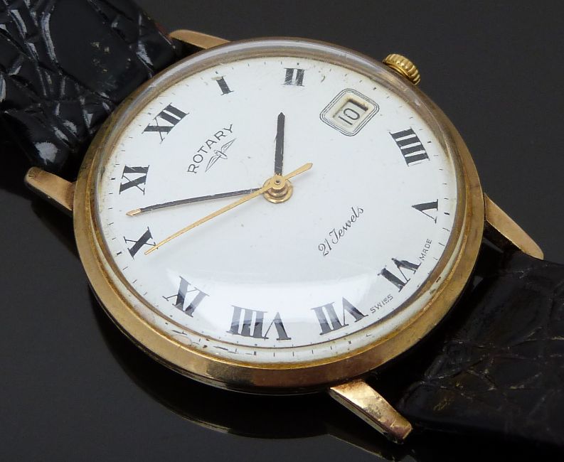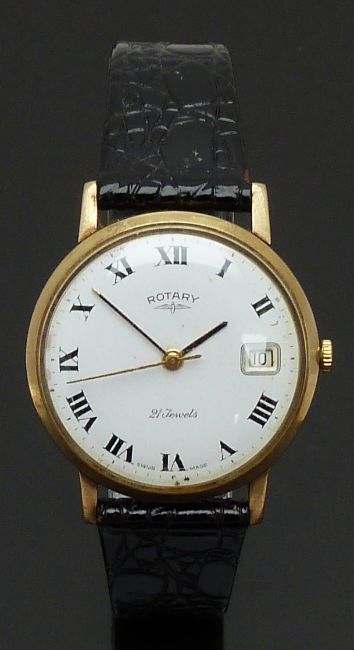 Rotary 9ct gold gentleman's wristwatch with date aperture, black hands and Roman numerals, white enamel dial and 21 jewel movement, on black leather strap, case diameter 34mm, serial number 3068.
