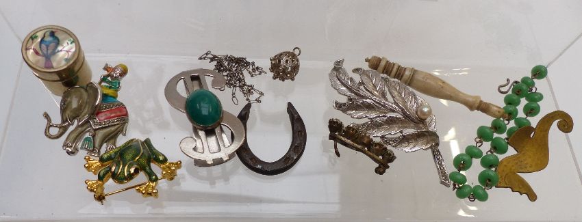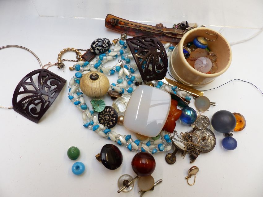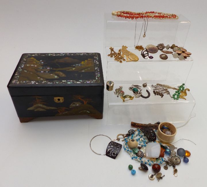 A collection of jewellery including cat brooch, enamel and marcasite brooch, agate, Victorian buttons, coral necklace, studs etc, in Japanese lacquer box