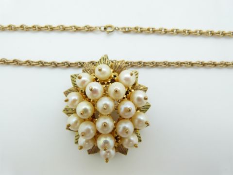 A 9ct gold necklace made up of oval links (13g) and a gilt pendant set with pearls