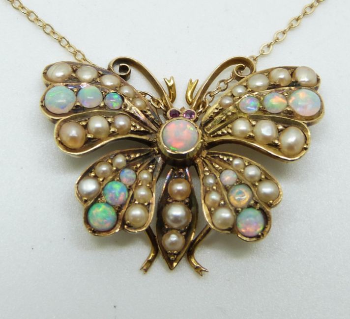 Edwardian 15ct gold pendant / brooch in the form of a butterfly set with opals, seed pearls and ruby eyes