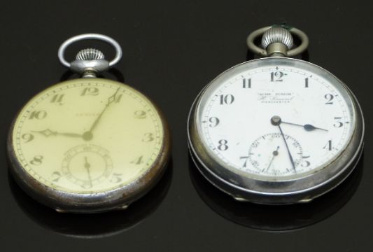 Two keyless winding open faced pocket watches one Zenith the other H Samual Acme Junior both with subsidiary seconds dials, blued hands, black Arabic numerals and white enamel dials, largest case diameter 50mm.