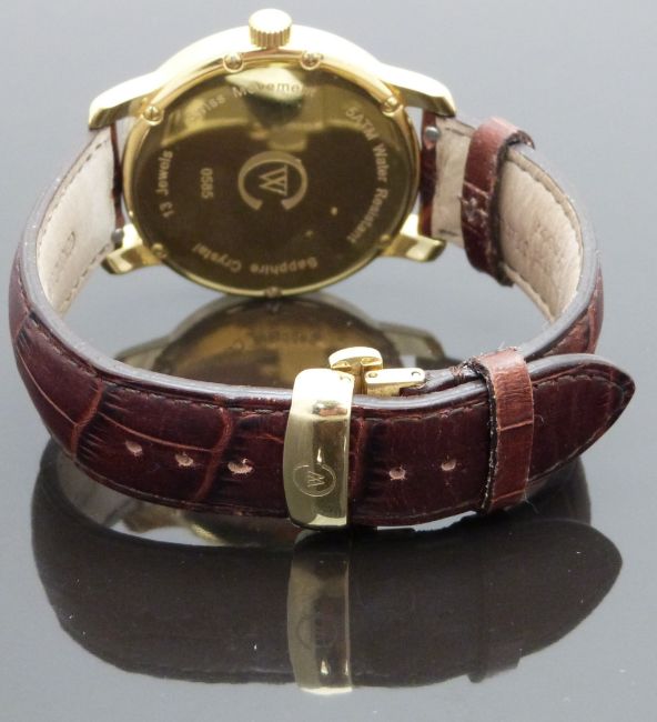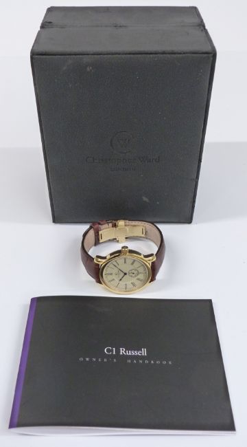 Christopher Ward C1 Russell gentleman's wristwatch with subsidiary seconds dial, stepped cream dial, blued hands, black Arabic numerals, gold plated case and calibre Ronda 1014 quartz movement, on brown leather strap, case diameter 40mm, serial number 0585, in original box with paperwork.
