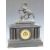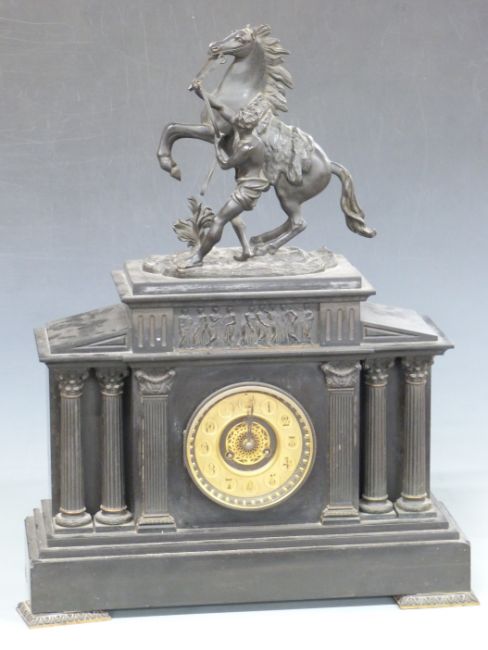 19thC black slate mantel clock in the Greek architectural style with apex top and reeded columns with acanthus leaf capitols, the dial with gilt pierced centre decoration, Arabic chapter ring and beetle and poker hands. The two train movement by Vincenti et Cie, stamped Medaille d'Argent 1855, striking on a gong. The whole surmounted by The Horse of Marly and raised on ornate squat bracket feet, 63cm tall
