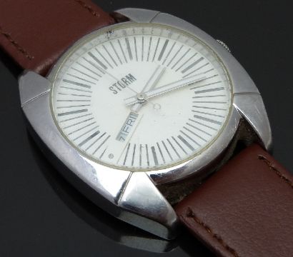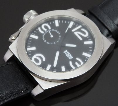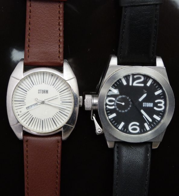 Two Storm gentleman's wristwatches Terrain with subsidiary date dial, white hands, black dial, stainless steel case and quartz movement, on black leather strap, case diameter 43mm and Malik with day and date aperture, silver and white hands, silver minute markers, white dial, stainless steel case and quartz movement, on brown leather strap, case diameter 40mm.