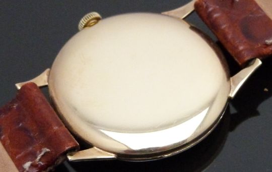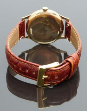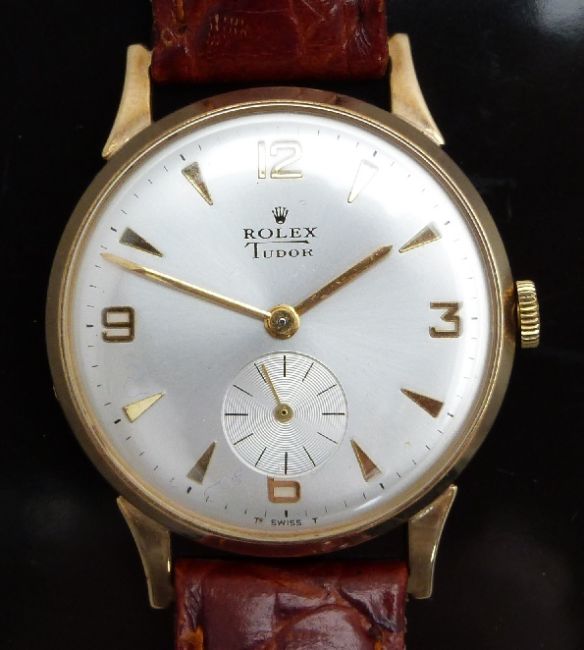 Rolex Tudor 9ct gold gentleman's wristwatch with inset subsidiary seconds dial, gold hands and hour markers and silver dial, on brown leather strap, case diameter 32mm.