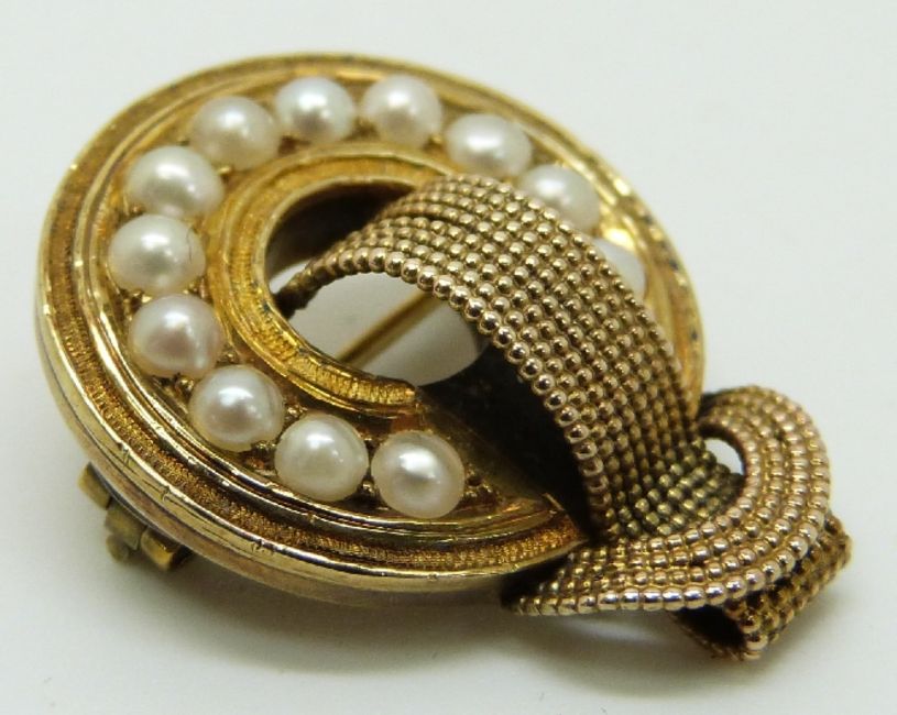 Victorian love knot brooch set with split pearls, 2.1 x 2.6cm