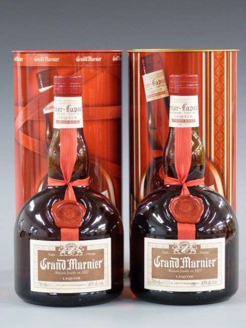 Two bottles of Grand Marnier Cordon Rouge cognac liqueur, 700ml, 40% vol, in original metal presentation tubes.
