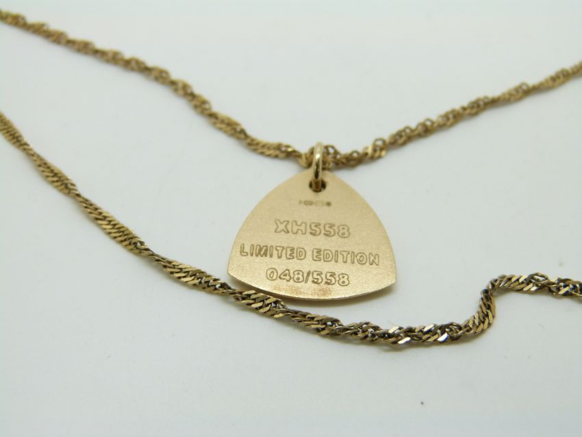 Two 9ct gold necklaces, one set with a limited edition 48/558 pendant decorated with an Avro Vulcan delta winged bomber, 10.2g