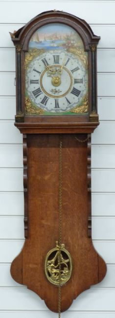 Mid 19thC Dutch wall clock, the painted Roman dial with waterside scene in arch, figural spandrels and pierced brass hands, the weight driven movement striking on a bell, height approximately 127cm