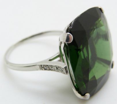 A platinum ring set with a large cushion cut tourmaline measuring approximately 22.6ct and diamonds in the shoulders, 7.6g, size O