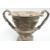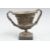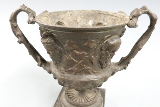Spelter miniature twin handled vase or urn with mask and foliate decoration, on square slate or similar base, H14cm