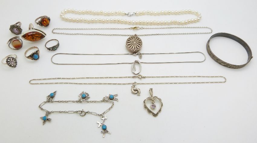 A pearl necklace, silver bangle, silver rings, silver locket etc