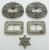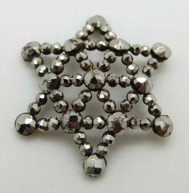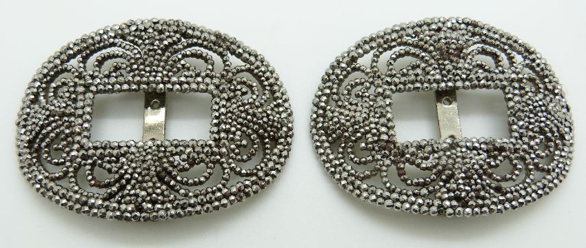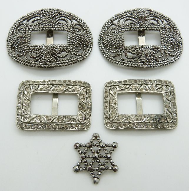 A pair of 19thC cut steel buckles, length 6cm, cut steel star and a pair of paste buckles