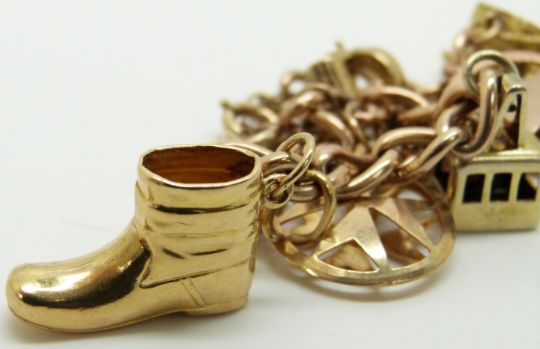 A 9ct gold charm bracelet with seven 9ct gold charms including telephone, church, etc, 30.8g