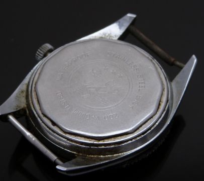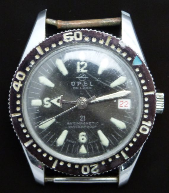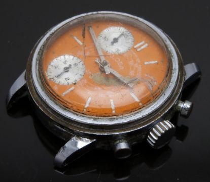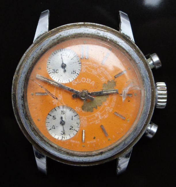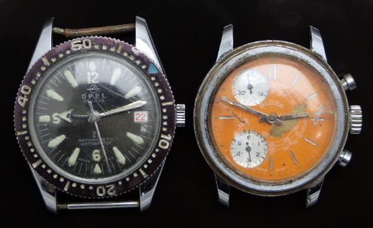 Two gentleman's wristwatches one Globa chronograph with orange dial, silver sub dials, luminous hands, baton markers, stainless steel case and R Lapanouse 1 jewel movement, case diameter 36mm and Opel with date aperture, luminous hands and hour markers, black dial and bezel and stainless steel case, case diameter 37mm.