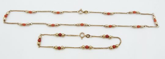 A 9ct gold necklace and bracelet set with coral beads and a coral necklace