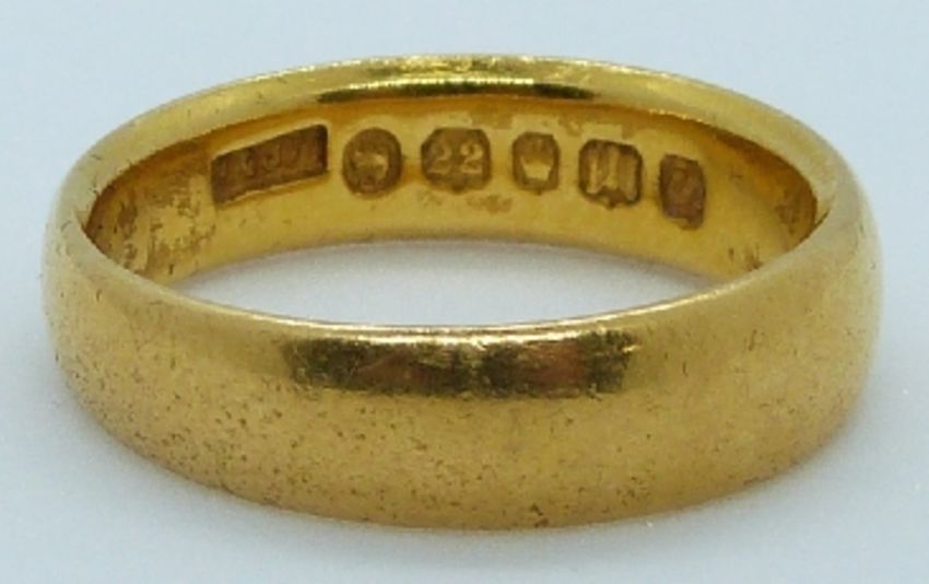 Victorian 22ct gold wedding band, Exeter 1874, maker J & JW, 8.6g, size O/P