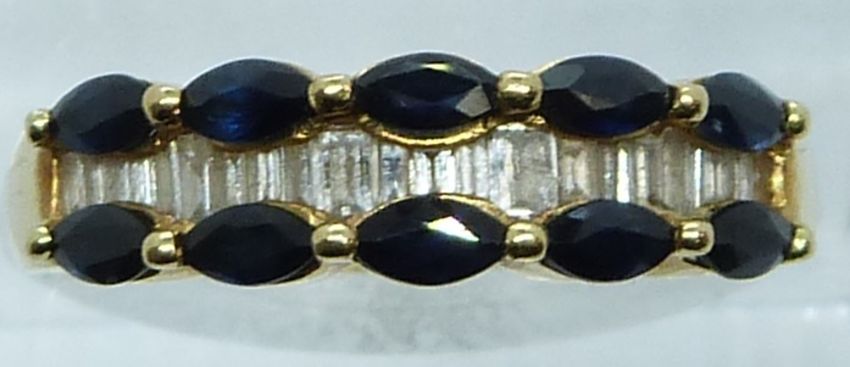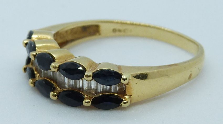 An 18ct gold ring set with marquise cut sapphires and baguette cut diamonds, 4.1g, size P