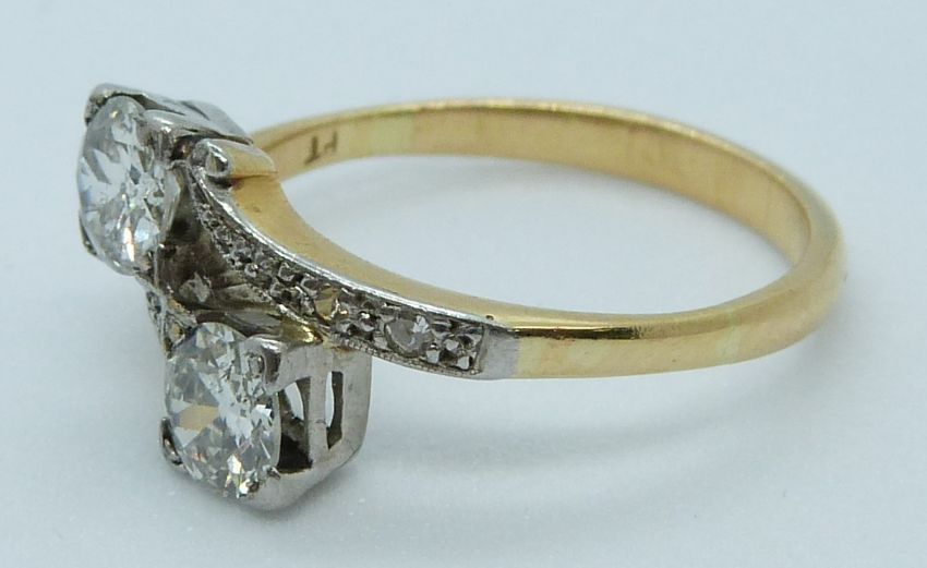 An 18ct gold ring set with two old cut diamonds, each approximately 0.35ct, and with diamond encrusted shoulders, 3.1g, size L