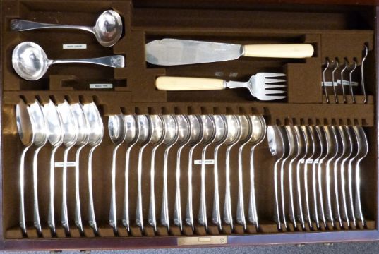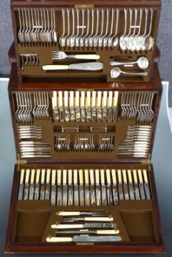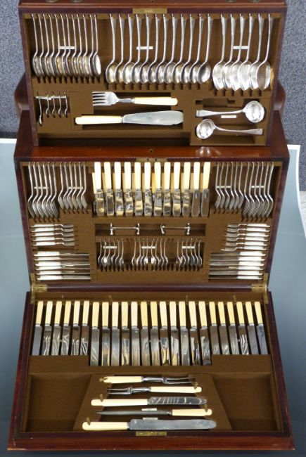 George V 12 place setting canteen of Old English pattern cutlery comprising twelve each of dessert forks, dinner forks and dessert spoons and four table spoons all Sheffield 1925 maker Francis Howard Ltd, nineteen teaspoons, Sheffield 1936, two table spoons, Sheffield 1936, twelve soup spoons, Sheffield 1935, four salt spoons, Sheffield 1934, all maker C W Fletcher & Son Ltd, two knife rests, Sheffield 1896 and a pair of ladles, London 1825, weight of all solid silver items 3600g, fish servers, twelve each of fish knives and forks and mother of pearl handled dessert knives and forks(one fork missing), all Sheffield 1936 maker C W Fletcher & Son Ltd, weight 1720g all in, twenty four knives, carving set etc, all having the Seymour (Duke of Somerset) crest and housed in  a fitted mahogany canteen on legs, width 74cm