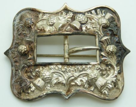 Victorian Scottish hallmarked silver belt buckle with embossed thistle decoration, Edinburgh with Victorian duty mark and maker's mark for James Crichton, width 6cm, weight 18g