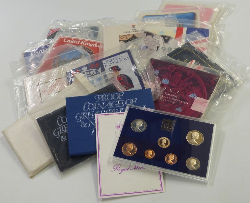 Eleven Royal Mint brilliant uncirculated UK coin presentation packs, 1980s and 1990s examples, together with 1977, 1981 and 1982 Coinage of Great Britain & Northern Ireland including a proof pack