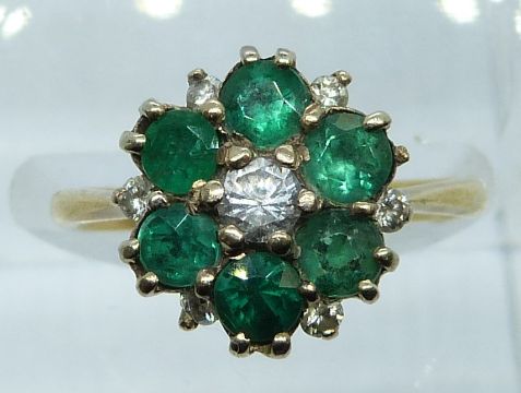 A yellow metal ring set with emeralds, diamonds and paste in a cluster, 4g, size K