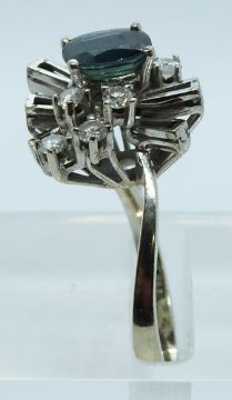 A white gold ring marked 14k set with a sapphire and diamonds, 4.5g, size J