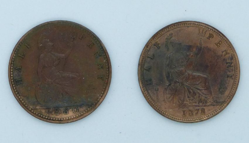 Victoria 1878 halfpenny, NEF with lustre and an 1860 example, VF+-NEF