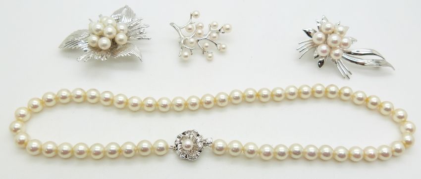 A collection of silver jewellery including rings, Art Deco silver heart locket, three silver brooches set with pearls, necklaces etc